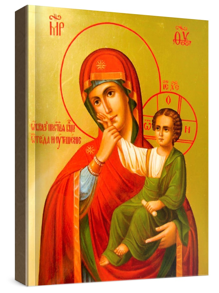 Икона отрада и утешение. Икона на заказ. Срок изготовления - 1-2 недели. Изображение нанесено на основу из натурального хвойного дерева методом прямой печати (не полиграфия). Деревянная основа иконы подвержена искусственному старению. Лик покрыт специальным лаком, что защищает икону от воздействий окружающей среды и обеспечивает хранение иконы в первозданном виде в течение нескольких десятилетий. Цена зависит от размера иконы (высота может незначительно отличаться от указанной величины в связи с точным соблюдением пропорций оригинала): 10x13*- 1500 руб. 30x40 - 5000 руб. 60x80 - 15000 руб. 15x18 - 2250 руб. 40x60 - 8000 руб. 80x120 - 20000 руб. 20x25 - 3000 руб. * - изготовление иконы 10х13 см возможно только при заказе от 3 шт.