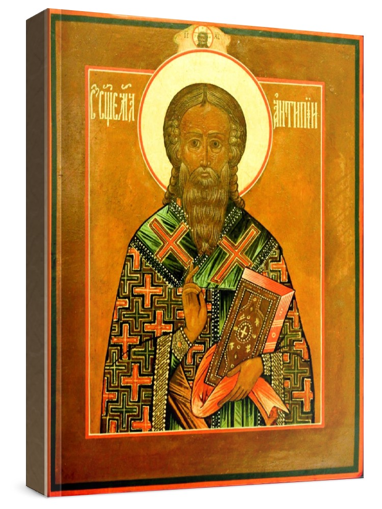 Икона антипа пергамский (копия старинной иконы). Икона на заказ. Срок изготовления - 1-2 недели. Изображение нанесено на основу из натурального хвойного дерева методом прямой печати. При работе соблюдены размерные пропорции и цветовая гамма оригинальной старинной иконы. Деревянная основа подвержена искусственному старению методом браширования, что делает икону более ценной и максимально похожей на многовековую семейную реликвию. Цена зависит от размера иконы (высота может незначительно отличаться от указанной величины в связи с точным соблюдением пропорций оригинала): 10x13*- 1500 руб. 30x40 - 5000 руб. 60x80 - 15000 руб. 15x18 - 2250 руб. 40x60 - 8000 руб. 80x120 - 20000 руб. 20x25 - 3000 руб. * - изготовление иконы 10х13 см возможно только при заказе от 3 шт.