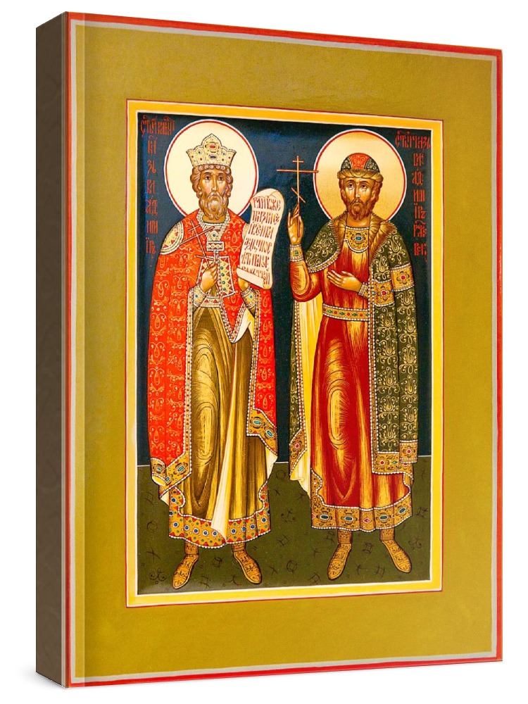 Икона владимир ржевский и князь владимир. Икона на заказ. Срок изготовления - 1-2 недели. Изображение нанесено на основу из натурального хвойного дерева методом прямой печати (не полиграфия). Деревянная основа иконы подвержена искусственному старению. Лик покрыт специальным лаком, что защищает икону от воздействий окружающей среды и обеспечивает хранение иконы в первозданном виде в течение нескольких десятилетий. Цена зависит от размера иконы (высота может незначительно отличаться от указанной величины в связи с точным соблюдением пропорций оригинала): 10x13*- 1500 руб. 30x40 - 5000 руб. 60x80 - 15000 руб. 15x18 - 2250 руб. 40x60 - 8000 руб. 80x120 - 20000 руб. 20x25 - 3000 руб. * - изготовление иконы 10х13 см возможно только при заказе от 3 шт.