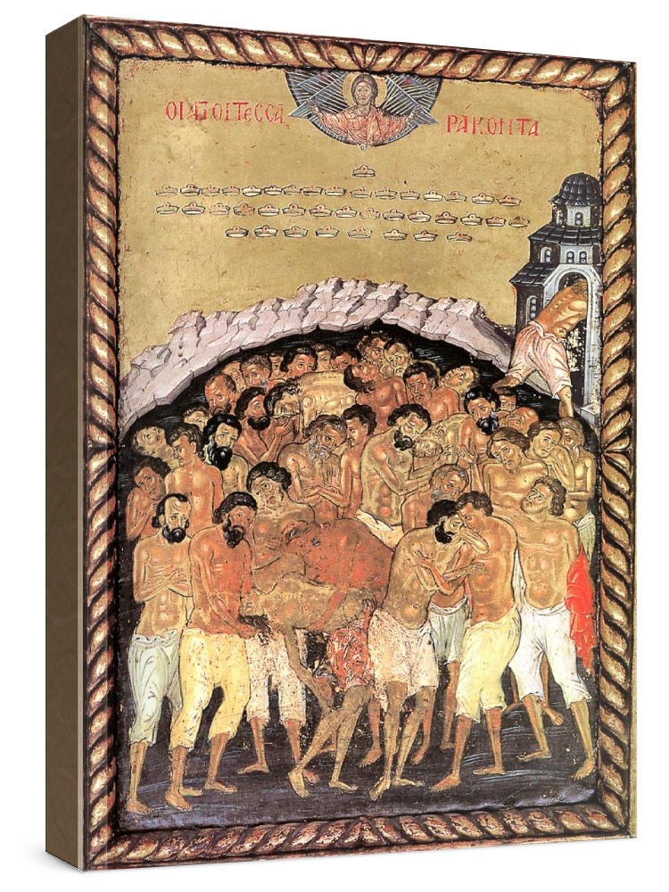 Икона 40 севастийских мучеников (копия старинной иконы). Икона на заказ. Срок изготовления - 1-2 недели. Изображение нанесено на основу из натурального хвойного дерева методом прямой печати (не полиграфия). Деревянная основа иконы подвержена искусственному старению. Лик покрыт специальным лаком, что защищает икону от воздействий окружающей среды и обеспечивает хранение иконы в первозданном виде в течение нескольких десятилетий. Цена зависит от размера иконы (высота может незначительно отличаться от указанной величины в связи с точным соблюдением пропорций оригинала): 10x13*- 1500 руб. 30x40 - 5000 руб. 60x80 - 15000 руб. 15x18 - 2250 руб. 40x60 - 8000 руб. 80x120 - 20000 руб. 20x25 - 3000 руб. * - изготовление иконы 10х13 см возможно только при заказе от 3 шт.