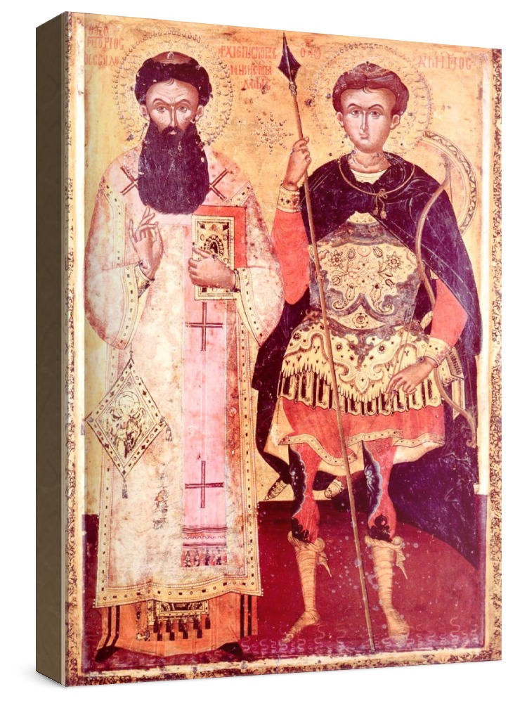 Икона григорий палама и димитрий солунский (копия старинной иконы). Икона на заказ. Срок изготовления - 1-2 недели. Изображение нанесено на основу из натурального хвойного дерева методом прямой печати (не полиграфия). Деревянная основа иконы подвержена искусственному старению. Лик покрыт специальным лаком, что защищает икону от воздействий окружающей среды и обеспечивает хранение иконы в первозданном виде в течение нескольких десятилетий. Цена зависит от размера иконы (высота может незначительно отличаться от указанной величины в связи с точным соблюдением пропорций оригинала): 10x13*- 1500 руб. 30x40 - 5000 руб. 60x80 - 15000 руб. 15x18 - 2250 руб. 40x60 - 8000 руб. 80x120 - 20000 руб. 20x25 - 3000 руб. * - изготовление иконы 10х13 см возможно только при заказе от 3 шт.