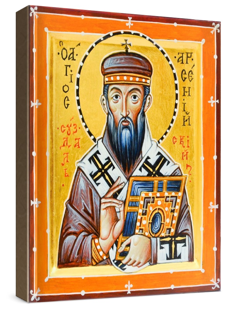 Икона арсений суздальский. Икона на заказ. Срок изготовления - 1-2 недели. Изображение нанесено на основу из натурального хвойного дерева методом прямой печати (не полиграфия). Деревянная основа иконы подвержена искусственному старению. Лик покрыт специальным лаком, что защищает икону от воздействий окружающей среды и обеспечивает хранение иконы в первозданном виде в течение нескольких десятилетий. Цена зависит от размера иконы (высота может незначительно отличаться от указанной величины в связи с точным соблюдением пропорций оригинала): 10x13*- 1500 руб. 30x40 - 5000 руб. 60x80 - 15000 руб. 15x18 - 2250 руб. 40x60 - 8000 руб. 80x120 - 20000 руб. 20x25 - 3000 руб. * - изготовление иконы 10х13 см возможно только при заказе от 3 шт.