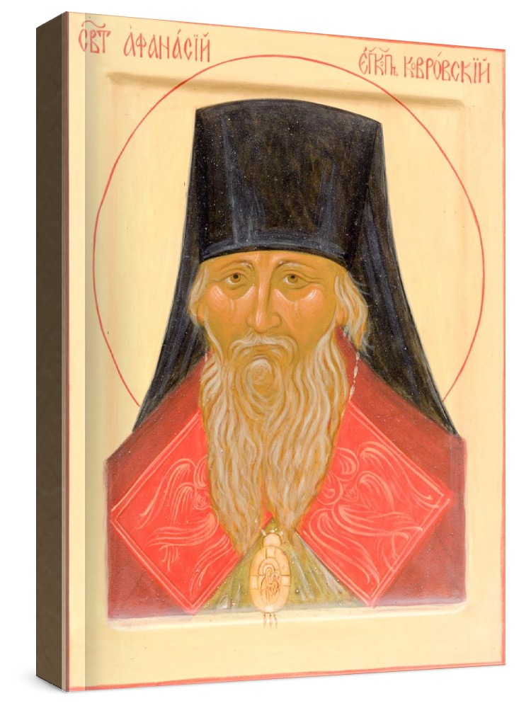 Икона афанасий ковровский. Икона на заказ. Срок изготовления - 1-2 недели. Изображение нанесено на основу из натурального хвойного дерева методом прямой печати (не полиграфия). Деревянная основа иконы подвержена искусственному старению. Лик покрыт специальным лаком, что защищает икону от воздействий окружающей среды и обеспечивает хранение иконы в первозданном виде в течение нескольких десятилетий. Цена зависит от размера иконы (высота может незначительно отличаться от указанной величины в связи с точным соблюдением пропорций оригинала): 10x13*- 1500 руб. 30x40 - 5000 руб. 60x80 - 15000 руб. 15x18 - 2250 руб. 40x60 - 8000 руб. 80x120 - 20000 руб. 20x25 - 3000 руб. * - изготовление иконы 10х13 см возможно только при заказе от 3 шт.