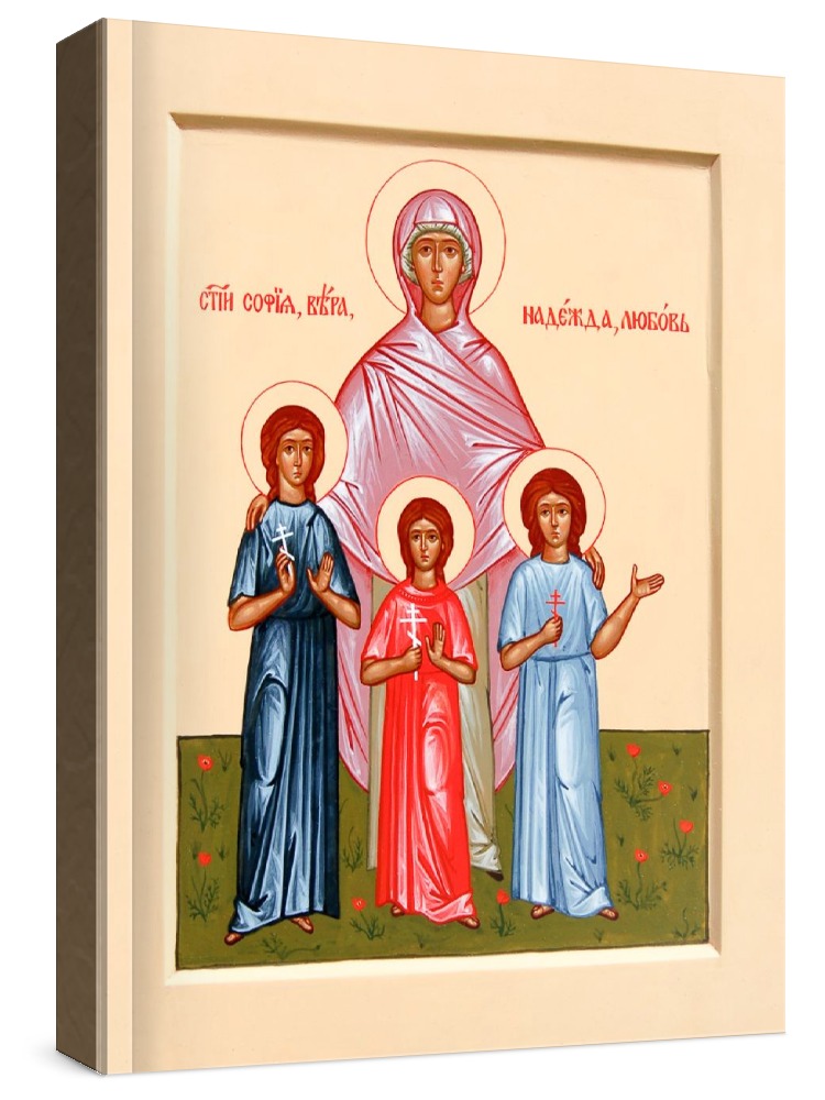 Икона вера, надежда, любовь и софия. Икона на заказ. Срок изготовления - 1-2 недели. Изображение нанесено на основу из натурального хвойного дерева методом прямой печати (не полиграфия). Деревянная основа иконы подвержена искусственному старению. Лик покрыт специальным лаком, что защищает икону от воздействий окружающей среды и обеспечивает хранение иконы в первозданном виде в течение нескольких десятилетий. Цена зависит от размера иконы (высота может незначительно отличаться от указанной величины в связи с точным соблюдением пропорций оригинала): 10x13*- 1500 руб. 30x40 - 5000 руб. 60x80 - 15000 руб. 15x18 - 2250 руб. 40x60 - 8000 руб. 80x120 - 20000 руб. 20x25 - 3000 руб. * - изготовление иконы 10х13 см возможно только при заказе от 3 шт.