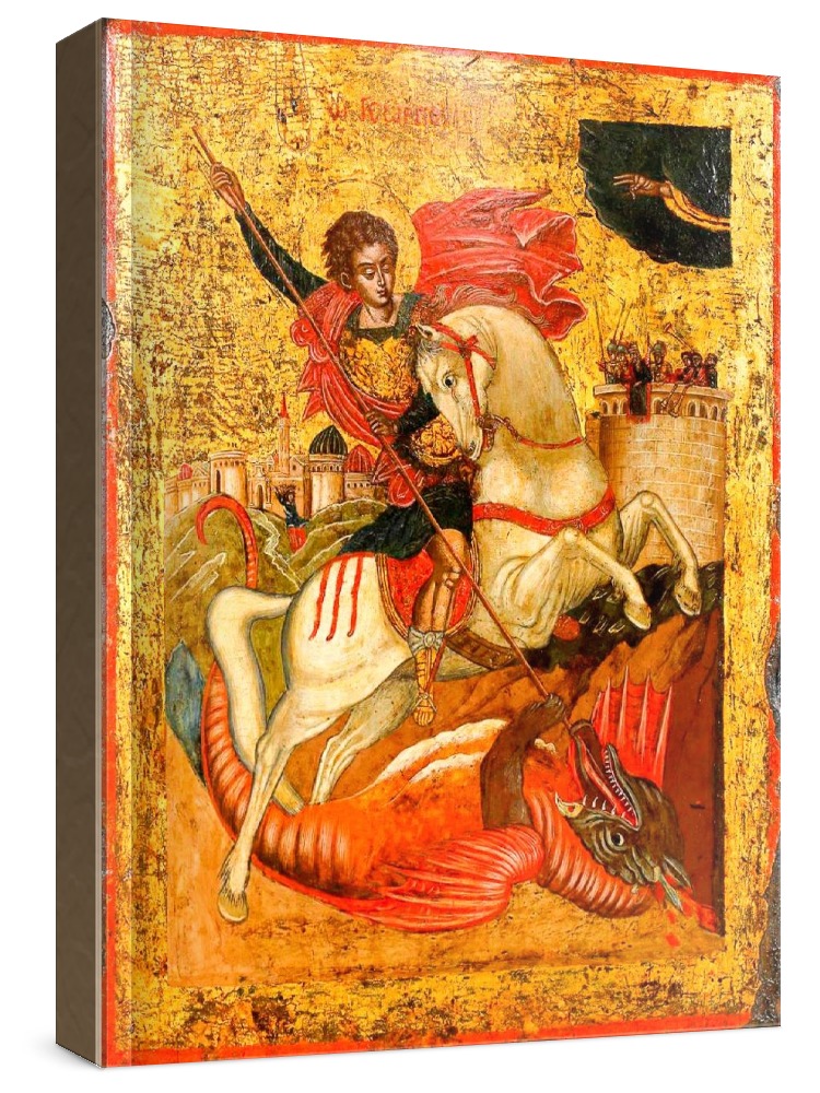 Икона георгий победоносец (копия старинной иконы). Икона на заказ. Срок изготовления - 1-2 недели. Изображение нанесено на основу из натурального хвойного дерева методом прямой печати (не полиграфия). Деревянная основа иконы подвержена искусственному старению. Лик покрыт специальным лаком, что защищает икону от воздействий окружающей среды и обеспечивает хранение иконы в первозданном виде в течение нескольких десятилетий. Цена зависит от размера иконы (высота может незначительно отличаться от указанной величины в связи с точным соблюдением пропорций оригинала): 10x13*- 1500 руб. 30x40 - 5000 руб. 60x80 - 15000 руб. 15x18 - 2250 руб. 40x60 - 8000 руб. 80x120 - 20000 руб. 20x25 - 3000 руб. * - изготовление иконы 10х13 см возможно только при заказе от 3 шт.