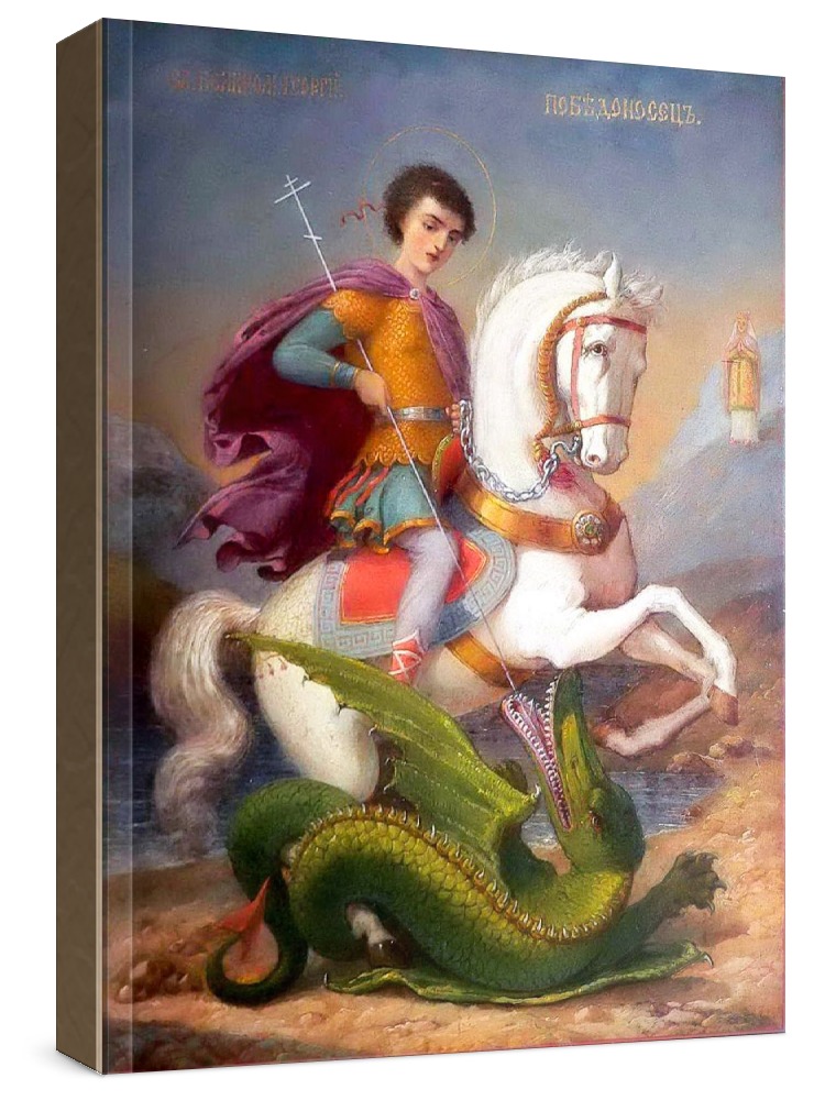 Икона георгий победоносец (копия иконы 19 века). Икона на заказ. Срок изготовления - 1-2 недели. Изображение нанесено на основу из натурального хвойного дерева методом прямой печати (не полиграфия). Деревянная основа иконы подвержена искусственному старению. Лик покрыт специальным лаком, что защищает икону от воздействий окружающей среды и обеспечивает хранение иконы в первозданном виде в течение нескольких десятилетий. Цена зависит от размера иконы (высота может незначительно отличаться от указанной величины в связи с точным соблюдением пропорций оригинала): 10x13*- 1500 руб. 30x40 - 5000 руб. 60x80 - 15000 руб. 15x18 - 2250 руб. 40x60 - 8000 руб. 80x120 - 20000 руб. 20x25 - 3000 руб. * - изготовление иконы 10х13 см возможно только при заказе от 3 шт.