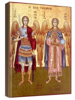 Икона михаил и гавриил. Икона на заказ. Срок изготовления - 1-2 недели. Изображение нанесено на основу из натурального хвойного дерева методом прямой печати (не полиграфия). Деревянная основа иконы подвержена искусственному старению. Лик покрыт специальным лаком, что защищает икону от воздействий окружающей среды и обеспечивает хранение иконы в первозданном виде в течение нескольких десятилетий. Цена зависит от размера иконы (высота может незначительно отличаться от указанной величины в связи с точным соблюдением пропорций оригинала): 10x13*- 1500 руб. 30x40 - 5000 руб. 60x80 - 15000 руб. 15x18 - 2250 руб. 40x60 - 8000 руб. 80x120 - 20000 руб. 20x25 - 3000 руб. * - изготовление иконы 10х13 см возможно только при заказе от 3 шт.