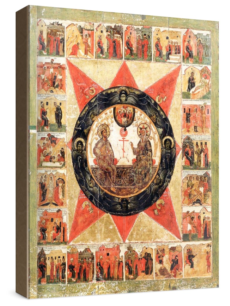 Икона новозаветная троица - сопрестолие (копия старинной иконы). Икона на заказ. Срок изготовления - 1-2 недели. Изображение нанесено на основу из натурального хвойного дерева методом прямой печати (не полиграфия). Деревянная основа иконы подвержена искусственному старению. Лик покрыт специальным лаком, что защищает икону от воздействий окружающей среды и обеспечивает хранение иконы в первозданном виде в течение нескольких десятилетий. Цена зависит от размера иконы (высота может незначительно отличаться от указанной величины в связи с точным соблюдением пропорций оригинала): 10x13*- 1500 руб. 30x40 - 5000 руб. 60x80 - 15000 руб. 15x18 - 2250 руб. 40x60 - 8000 руб. 80x120 - 20000 руб. 20x25 - 3000 руб. * - изготовление иконы 10х13 см возможно только при заказе от 3 шт.