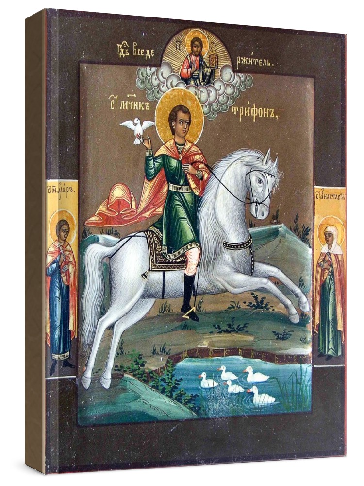 Икона трифон апамейский (копия иконы 19 века). Икона на заказ. Срок изготовления - 1-2 недели. Изображение нанесено на основу из натурального хвойного дерева методом прямой печати (не полиграфия). Деревянная основа иконы подвержена искусственному старению. Лик покрыт специальным лаком, что защищает икону от воздействий окружающей среды и обеспечивает хранение иконы в первозданном виде в течение нескольких десятилетий. Цена зависит от размера иконы (высота может незначительно отличаться от указанной величины в связи с точным соблюдением пропорций оригинала): 10x13*- 1500 руб. 30x40 - 5000 руб. 60x80 - 15000 руб. 15x18 - 2250 руб. 40x60 - 8000 руб. 80x120 - 20000 руб. 20x25 - 3000 руб. * - изготовление иконы 10х13 см возможно только при заказе от 3 шт.