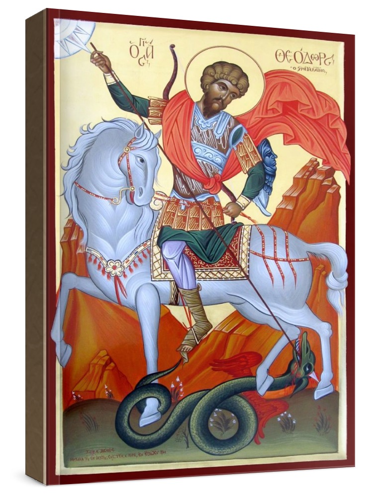 Феодор стратилат (икона на дереве). Икона на заказ. Срок изготовления - 5-14 дней. Изображение нанесено на основу из натурального хвойного дерева методом прямой печати (не полиграфия). Деревянная основа иконы подвержена искусственному старению. Лик покрыт специальным лаком, что защищает икону от воздействий окружающей среды и обеспечивает хранение иконы в первозданном виде в течение нескольких десятилетий. Цена зависит от размера иконы (высота может незначительно отличаться от указанной величины в связи с точным соблюдением пропорций оригинала): 10x13*- 1500 руб. 30x40 - 5000 руб. 60x80 - 15000 руб. 15x18 - 2250 руб. 40x60 - 8000 руб. 80x120 - 20000 руб. 20x25 - 3000 руб. * - изготовление иконы 10х13 см возможно только при заказе от 3 шт.