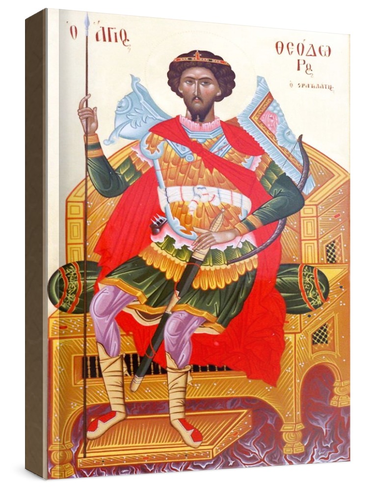 Феодор стратилат (икона на дереве). Икона на заказ. Срок изготовления - 5-14 дней. Изображение нанесено на основу из натурального хвойного дерева методом прямой печати (не полиграфия). Деревянная основа иконы подвержена искусственному старению. Лик покрыт специальным лаком, что защищает икону от воздействий окружающей среды и обеспечивает хранение иконы в первозданном виде в течение нескольких десятилетий. Цена зависит от размера иконы (высота может незначительно отличаться от указанной величины в связи с точным соблюдением пропорций оригинала): 10x13*- 1500 руб. 30x40 - 5000 руб. 60x80 - 15000 руб. 15x18 - 2250 руб. 40x60 - 8000 руб. 80x120 - 20000 руб. 20x25 - 3000 руб. * - изготовление иконы 10х13 см возможно только при заказе от 3 шт.