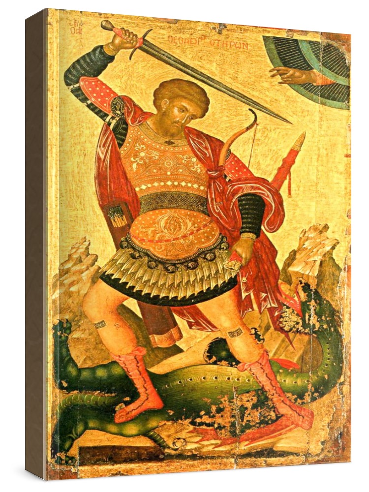 Икона феодор тирон (копия иконы 15 века). Икона на заказ. Срок изготовления - 5-14 дней. Изображение нанесено на основу из натурального хвойного дерева методом прямой печати (не полиграфия). Деревянная основа иконы подвержена искусственному старению. Лик покрыт специальным лаком, что защищает икону от воздействий окружающей среды и обеспечивает хранение иконы в первозданном виде в течение нескольких десятилетий. Цена зависит от размера иконы (высота может незначительно отличаться от указанной величины в связи с точным соблюдением пропорций оригинала): 10x13 - 1500 руб. 30x40 - 5000 руб. 60x80 - 15000 руб. 15x18 - 2250 руб. 40x60 - 8000 руб. 80x120 - 20000 руб. 20x25 - 3000 руб.