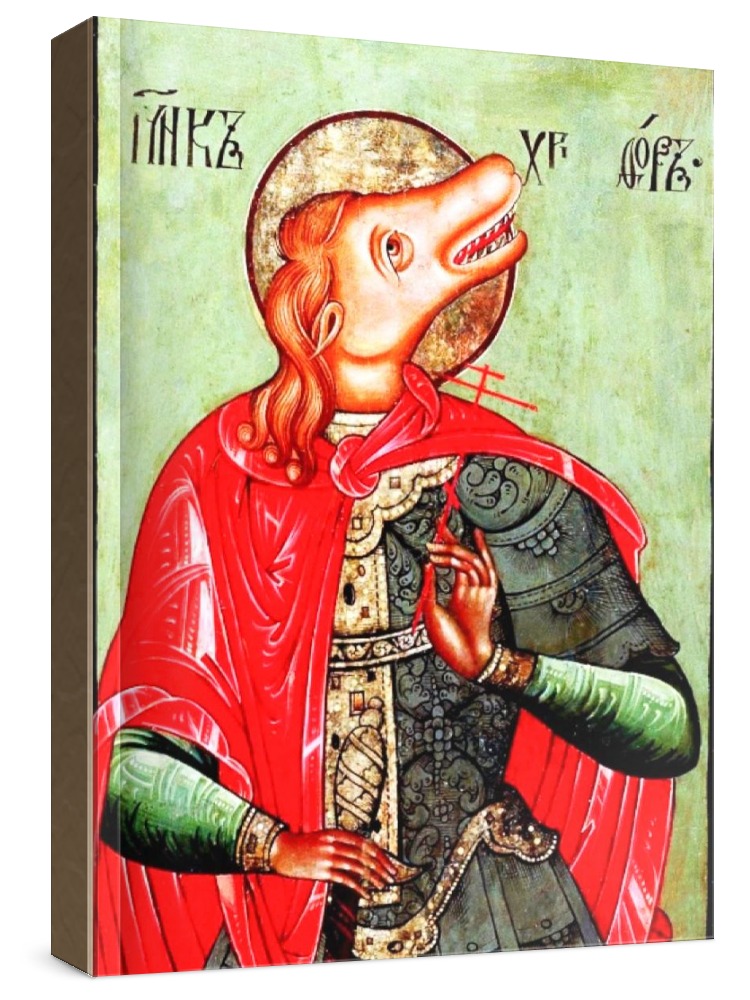 Икона христофор псеглавец (копия иконы 17 века). Икона на заказ. Срок изготовления - 5-14 дней. Изображение нанесено на основу из натурального хвойного дерева методом прямой печати (не полиграфия). Деревянная основа иконы подвержена искусственному старению. Лик покрыт специальным лаком, что защищает икону от воздействий окружающей среды и обеспечивает хранение иконы в первозданном виде в течение нескольких десятилетий. Цена зависит от размера иконы (высота может незначительно отличаться от указанной величины в связи с точным соблюдением пропорций оригинала): 10x13 - 1500 руб. 30x40 - 5000 руб. 60x80 - 15000 руб. 15x18 - 2250 руб. 40x60 - 8000 руб. 80x120 - 20000 руб. 20x25 - 3000 руб.