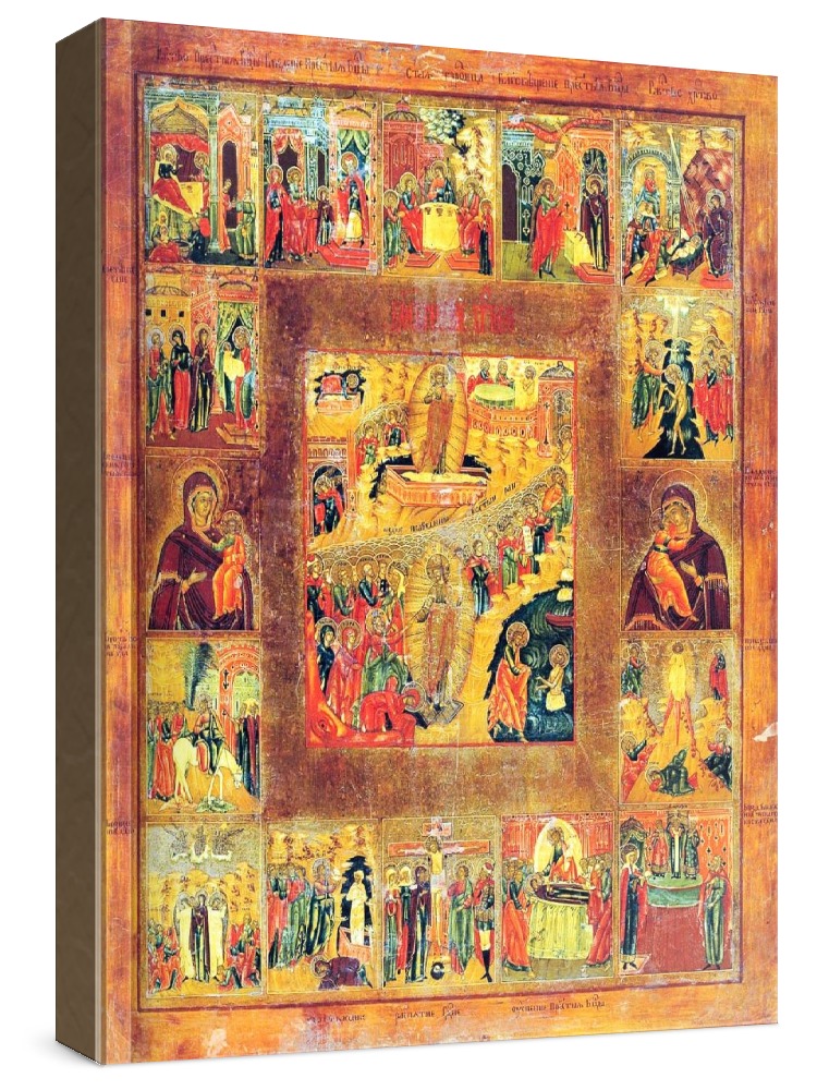 Икона воскресение христово с праздниками (копия старинной иконы). Икона на заказ. Срок изготовления - 5-14 дней. Изображение нанесено на основу из натурального хвойного дерева методом прямой печати (не полиграфия). Деревянная основа иконы подвержена искусственному старению. Лик покрыт специальным лаком, что защищает икону от воздействий окружающей среды и обеспечивает хранение иконы в первозданном виде в течение нескольких десятилетий. Цена зависит от размера иконы (высота может незначительно отличаться от указанной величины в связи с точным соблюдением пропорций оригинала): 10x13 - 1500 руб. 30x40 - 5000 руб. 60x80 - 15000 руб. 15x18 - 2250 руб. 40x60 - 8000 руб. 80x120 - 20000 руб. 20x25 - 3000 руб.