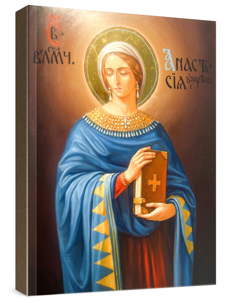 Анастасия узорешительница (икона на дереве). Икона на заказ. Срок изготовления - 5-14 дней. Изображение нанесено на основу из натурального хвойного дерева методом прямой печати (не полиграфия). Деревянная основа иконы подвержена искусственному старению. Лик покрыт специальным лаком, что защищает икону от воздействий окружающей среды и обеспечивает хранение иконы в первозданном виде в течение нескольких десятилетий. Цена зависит от размера иконы (высота может незначительно отличаться от указанной величины в связи с точным соблюдением пропорций образца-оригинала): 10x13 - 1500 руб. 30x40 - 5000 руб. 60x80 - 15000 руб. 15x18 - 2250 руб. 40x60 - 8000 руб. 80x120 - 20000 руб. 20x25 - 3000 руб.