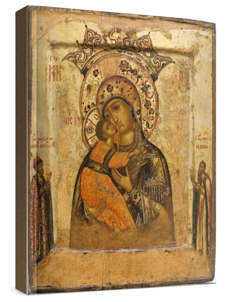 Волоколамская икона бм (копия старинной). Изображение нанесено на основу из натурального хвойного дерева методом прямой печати. При работе соблюдены размерные пропорции и цветовая гамма оригинальной старинной иконы. Деревянная основа подвержена искусственному старению методом браширования, что делает икону более ценной и максимально похожей на многовековую семейную реликвию. Цена зависит от размера иконы (высота может незначительно отличаться от указанной величины в связи с точным соблюдением пропорций оригинала): 10x13 - 1500 руб. 30x40 - 5000 руб. 60x80 - 15000 руб. 15x18 - 2250 руб. 40x60 - 8000 руб. 80x120 - 20000 руб. 20x25 - 3000 руб.