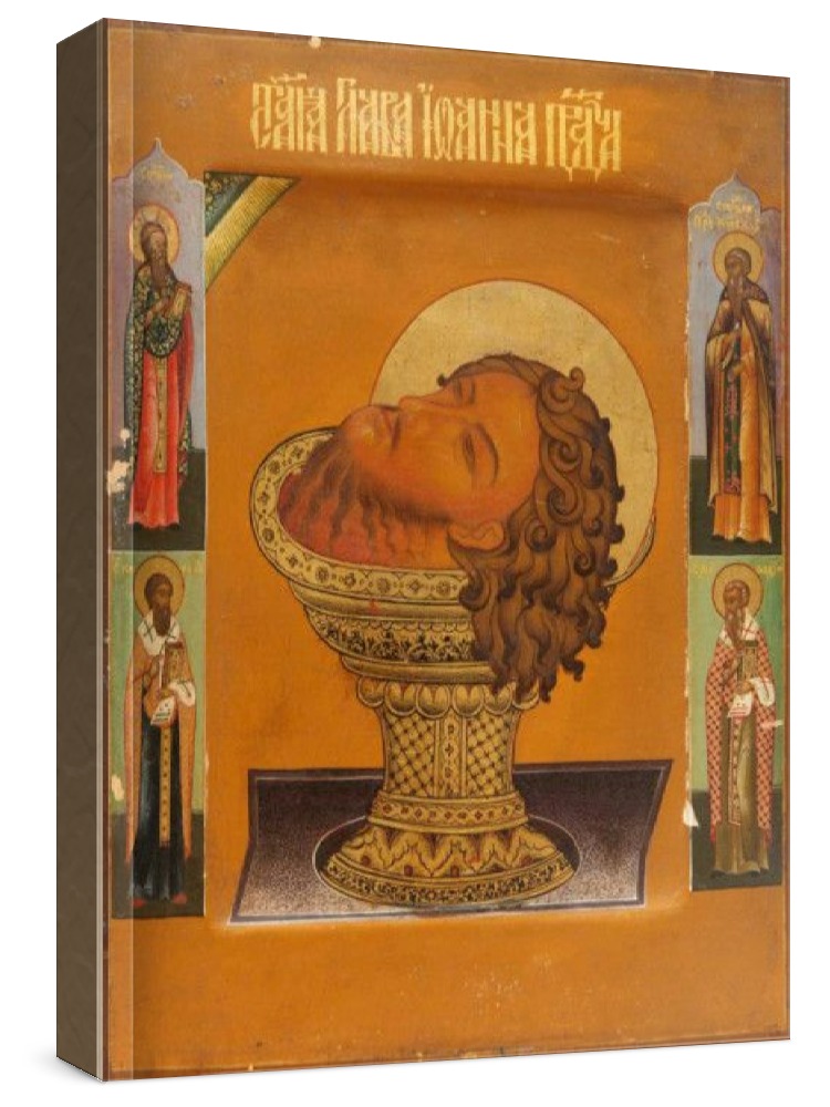 Икона глава иоанна предтечи (копия старинной иконы). Икона на заказ. Срок изготовления - 5-14 дней. Изображение нанесено на основу из натурального хвойного дерева методом прямой печати (не полиграфия). Деревянная основа иконы подвержена искусственному старению. Лик покрыт специальным лаком, что защищает икону от воздействий окружающей среды и обеспечивает хранение иконы в первозданном виде в течение нескольких десятилетий. Цена зависит от размера иконы (высота может незначительно отличаться от указанной величины в связи с точным соблюдением пропорций оригинала): 10x13 - 1500 руб. 30x40 - 5000 руб. 60x80 - 15000 руб. 15x18 - 2250 руб. 40x60 - 8000 руб. 80x120 - 20000 руб. 20x25 - 3000 руб.