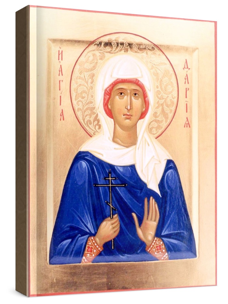 Дария римская (икона на дереве). Икона на заказ. Срок изготовления - 5-14 дней. Изображение нанесено на основу из натурального хвойного дерева методом прямой печати (не полиграфия). Деревянная основа иконы подвержена искусственному старению. Лик покрыт специальным лаком, что защищает икону от воздействий окружающей среды и обеспечивает хранение иконы в первозданном виде в течение нескольких десятилетий. Цена зависит от размера иконы (высота может незначительно отличаться от указанной величины в связи с точным соблюдением пропорций образца-оригинала): 10x13 - 1500 руб. 30x40 - 5000 руб. 60x80 - 15000 руб. 15x18 - 2250 руб. 40x60 - 8000 руб. 80x120 - 20000 руб. 20x25 - 3000 руб.
