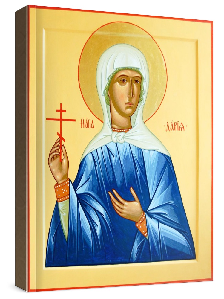 Дария римская (икона на дереве). Икона на заказ. Срок изготовления - 5-14 дней. Изображение нанесено на основу из натурального хвойного дерева методом прямой печати (не полиграфия). Деревянная основа иконы подвержена искусственному старению. Лик покрыт специальным лаком, что защищает икону от воздействий окружающей среды и обеспечивает хранение иконы в первозданном виде в течение нескольких десятилетий. Цена зависит от размера иконы (высота может незначительно отличаться от указанной величины в связи с точным соблюдением пропорций образца-оригинала): 10x13 - 1500 руб. 30x40 - 5000 руб. 60x80 - 15000 руб. 15x18 - 2250 руб. 40x60 - 8000 руб. 80x120 - 20000 руб. 20x25 - 3000 руб.