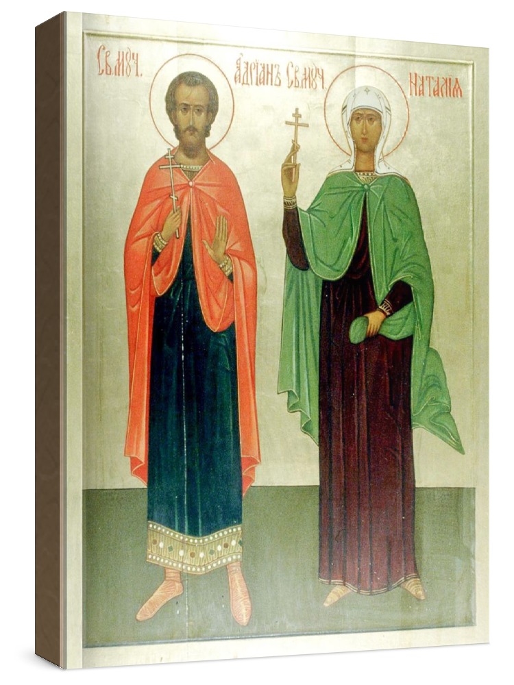 Адриан и наталия (икона на дереве). Икона на заказ. Срок изготовления - 5-14 дней. Изображение нанесено на основу из натурального хвойного дерева методом прямой печати (не полиграфия). Деревянная основа иконы подвержена искусственному старению. Лик покрыт специальным лаком, что защищает икону от воздействий окружающей среды и обеспечивает хранение иконы в первозданном виде в течение нескольких десятилетий. Цена зависит от размера иконы (высота может незначительно отличаться от указанной величины в связи с точным соблюдением пропорций образца-оригинала): 10x13 - 1500 руб. 30x40 - 5000 руб. 60x80 - 15000 руб. 15x18 - 2250 руб. 40x60 - 8000 руб. 80x120 - 20000 руб. 20x25 - 3000 руб.
