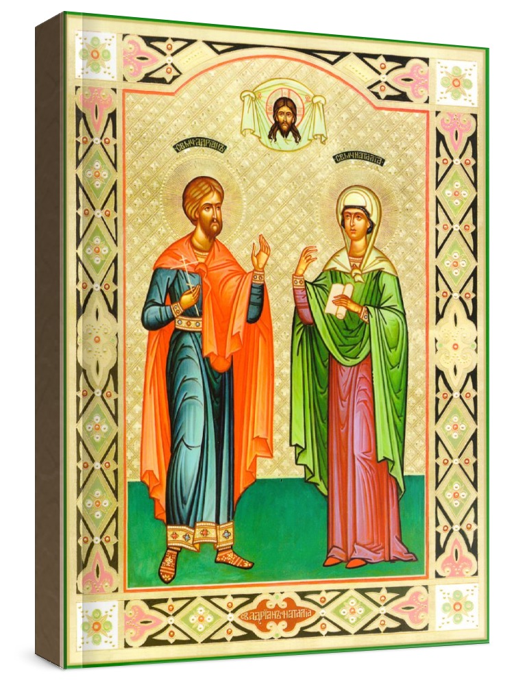 Адриан и наталия (икона на дереве). Икона на заказ. Срок изготовления - 5-14 дней. Изображение нанесено на основу из натурального хвойного дерева методом прямой печати (не полиграфия). Деревянная основа иконы подвержена искусственному старению. Лик покрыт специальным лаком, что защищает икону от воздействий окружающей среды и обеспечивает хранение иконы в первозданном виде в течение нескольких десятилетий. Цена зависит от размера иконы (высота может незначительно отличаться от указанной величины в связи с точным соблюдением пропорций образца-оригинала): 10x13 - 1500 руб. 30x40 - 5000 руб. 60x80 - 15000 руб. 15x18 - 2250 руб. 40x60 - 8000 руб. 80x120 - 20000 руб. 20x25 - 3000 руб.