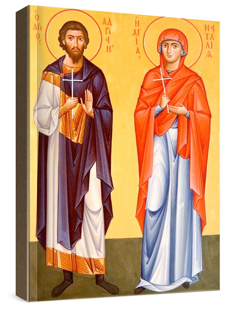 Адриан и наталия (икона на дереве). Икона на заказ. Срок изготовления - 5-14 дней. Изображение нанесено на основу из натурального хвойного дерева методом прямой печати (не полиграфия). Деревянная основа иконы подвержена искусственному старению. Лик покрыт специальным лаком, что защищает икону от воздействий окружающей среды и обеспечивает хранение иконы в первозданном виде в течение нескольких десятилетий. Цена зависит от размера иконы (высота может незначительно отличаться от указанной величины в связи с точным соблюдением пропорций образца-оригинала): 10x13 - 1500 руб. 30x40 - 5000 руб. 60x80 - 15000 руб. 15x18 - 2250 руб. 40x60 - 8000 руб. 80x120 - 20000 руб. 20x25 - 3000 руб.