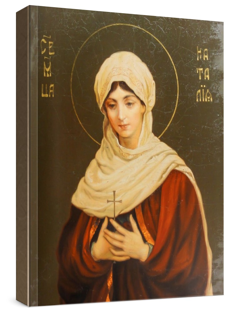 Наталия никомидийская (икона на дереве). Икона на заказ. Срок изготовления - 5-14 дней. Изображение нанесено на основу из натурального хвойного дерева методом прямой печати (не полиграфия). Деревянная основа иконы подвержена искусственному старению. Лик покрыт специальным лаком, что защищает икону от воздействий окружающей среды и обеспечивает хранение иконы в первозданном виде в течение нескольких десятилетий. Цена зависит от размера иконы (высота может незначительно отличаться от указанной величины в связи с точным соблюдением пропорций образца-оригинала): 10x13 - 1500 руб. 30x40 - 5000 руб. 60x80 - 15000 руб. 15x18 - 2250 руб. 40x60 - 8000 руб. 80x120 - 20000 руб. 20x25 - 3000 руб.