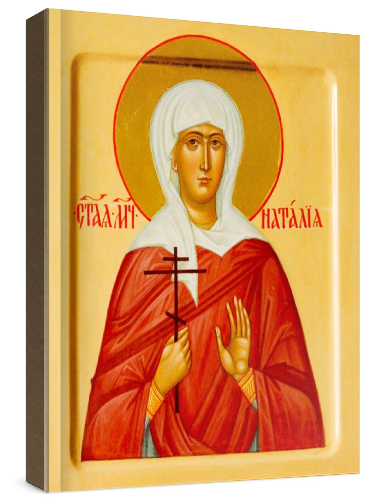 Наталия никомидийская (икона на дереве). Икона на заказ. Срок изготовления - 5-14 дней. Изображение нанесено на основу из натурального хвойного дерева методом прямой печати (не полиграфия). Деревянная основа иконы подвержена искусственному старению. Лик покрыт специальным лаком, что защищает икону от воздействий окружающей среды и обеспечивает хранение иконы в первозданном виде в течение нескольких десятилетий. Цена зависит от размера иконы (высота может незначительно отличаться от указанной величины в связи с точным соблюдением пропорций образца-оригинала): 10x13 - 1500 руб. 30x40 - 5000 руб. 60x80 - 15000 руб. 15x18 - 2250 руб. 40x60 - 8000 руб. 80x120 - 20000 руб. 20x25 - 3000 руб.
