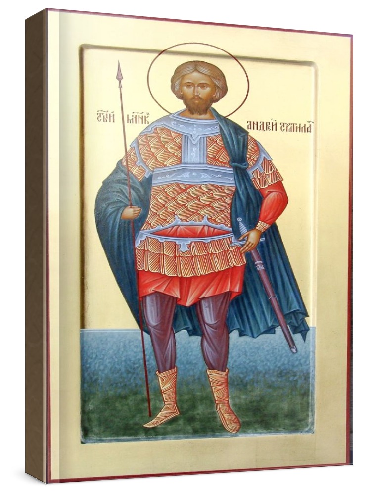 Андрей стратилат (икона на дереве). Икона на заказ. Срок изготовления - 5-14 дней. Изображение нанесено на основу из натурального хвойного дерева методом прямой печати (не полиграфия). Деревянная основа иконы подвержена искусственному старению. Лик покрыт специальным лаком, что защищает икону от воздействий окружающей среды и обеспечивает хранение иконы в первозданном виде в течение нескольких десятилетий. Цена зависит от размера иконы (высота может незначительно отличаться от указанной величины в связи с точным соблюдением пропорций образца-оригинала): 10x13 - 1500 руб. 30x40 - 5000 руб. 60x80 - 15000 руб. 15x18 - 2250 руб. 40x60 - 8000 руб. 80x120 - 20000 руб. 20x25 - 3000 руб.