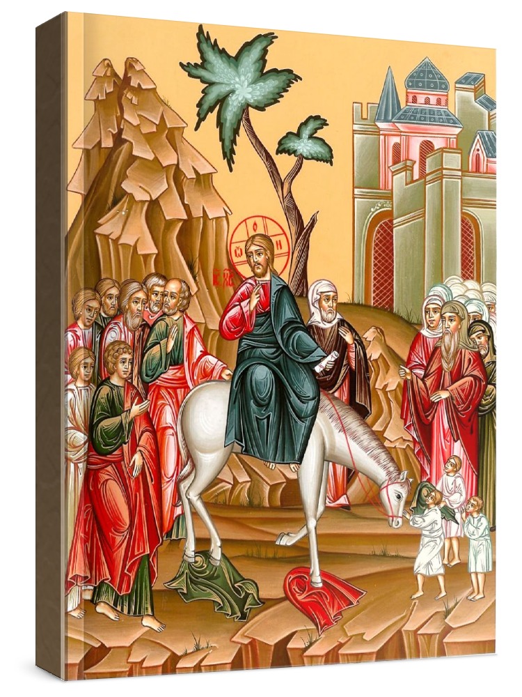Вход господень в иерусалим (икона на дереве). Икона на заказ. Срок изготовления - 5-14 дней. Изображение нанесено на основу из натурального хвойного дерева методом прямой печати (не полиграфия). Деревянная основа иконы подвержена искусственному старению. Лик покрыт специальным лаком, что защищает икону от воздействий окружающей среды и обеспечивает хранение иконы в первозданном виде в течение нескольких десятилетий. Цена зависит от размера иконы (высота может незначительно отличаться от указанной величины в связи с точным соблюдением пропорций образца-оригинала): 10x13 - 1500 руб. 30x40 - 5000 руб. 60x80 - 15000 руб. 15x18 - 2250 руб. 40x60 - 8000 руб. 80x120 - 20000 руб. 20x25 - 3000 руб.