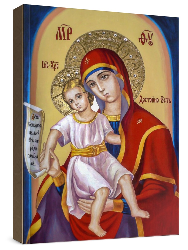Достойно есть (икона на дереве). Икона на заказ. Срок изготовления - 5-14 дней. Изображение нанесено на основу из натурального хвойного дерева методом прямой печати (не полиграфия). Деревянная основа иконы подвержена искусственному старению. Лик покрыт специальным лаком, что защищает икону от воздействий окружающей среды и обеспечивает хранение иконы в первозданном виде в течение нескольких десятилетий. Цена зависит от размера иконы (высота может незначительно отличаться от указанной величины в связи с точным соблюдением пропорций образца-оригинала): 10x13 - 1500 руб. 30x40 - 5000 руб. 60x80 - 15000 руб. 15x18 - 2250 руб. 40x60 - 8000 руб. 80x120 - 20000 руб. 20x25 - 3000 руб.