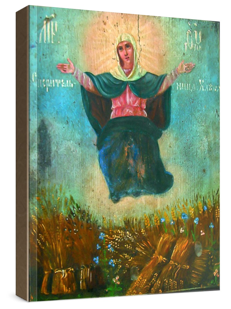 Икона спорительница хлебов (копия старинной иконы).     Икона на заказ. Срок изготовления - 5-14 дней.  Изображение нанесено на основу из натурального хвойного дерева методом прямой печати (не полиграфия).  При работе соблюдены размерные пропорции и цветовая гамма оригинальной старинной иконы.  Деревянная основа иконы подвержена искусственному старению.  Лик покрыт специальным лаком, что защищает икону от воздействий окружающей среды и обеспечивает хранение иконы в первозданном виде в течение нескольких десятилетий.  Цена зависит от размера иконы (высота может незначительно отличаться от указанной величины в связи с точным соблюдением пропорций оригинала):  10x13 - 1500 руб. 30x40 - 5000 руб. 60x80 - 15000 руб.   15x18 - 2250 руб. 40x60 - 8000 руб. 80x120 - 20000 руб.  20x25 - 3000 руб.
