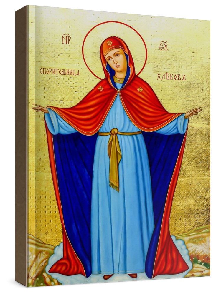 Спорительница хлебов (икона на дереве). Икона на заказ. Срок изготовления - 5-14 дней. Изображение нанесено на основу из натурального хвойного дерева методом прямой печати (не полиграфия). Деревянная основа иконы подвержена искусственному старению. Лик покрыт специальным лаком, что защищает икону от воздействий окружающей среды и обеспечивает хранение иконы в первозданном виде в течение нескольких десятилетий. Цена зависит от размера иконы (высота может незначительно отличаться от указанной величины в связи с точным соблюдением пропорций образца-оригинала): 10x13 - 1500 руб. 30x40 - 5000 руб. 60x80 - 15000 руб. 15x18 - 2250 руб. 40x60 - 8000 руб. 80x120 - 20000 руб. 20x25 - 3000 руб.