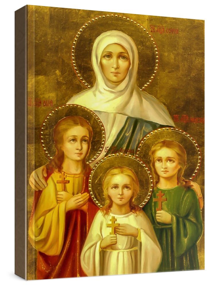 Вера, надежда, любовь и софия (икона на дереве). Икона на заказ. Срок изготовления - 1-2 недели. Изображение нанесено на основу из натурального хвойного дерева методом прямой печати (не полиграфия). Деревянная основа иконы подвержена искусственному старению. Лик покрыт специальным лаком, что защищает икону от воздействий окружающей среды и обеспечивает хранение иконы в первозданном виде в течение нескольких десятилетий. Цена зависит от размера иконы (высота может незначительно отличаться от указанной величины в связи с точным соблюдением пропорций оригинала): 10x13*- 1500 руб. 30x40 - 5000 руб. 60x80 - 15000 руб. 15x18 - 2250 руб. 40x60 - 8000 руб. 80x120 - 20000 руб. 20x25 - 3000 руб. * - изготовление иконы 10х13 см возможно только при заказе от 3 шт.