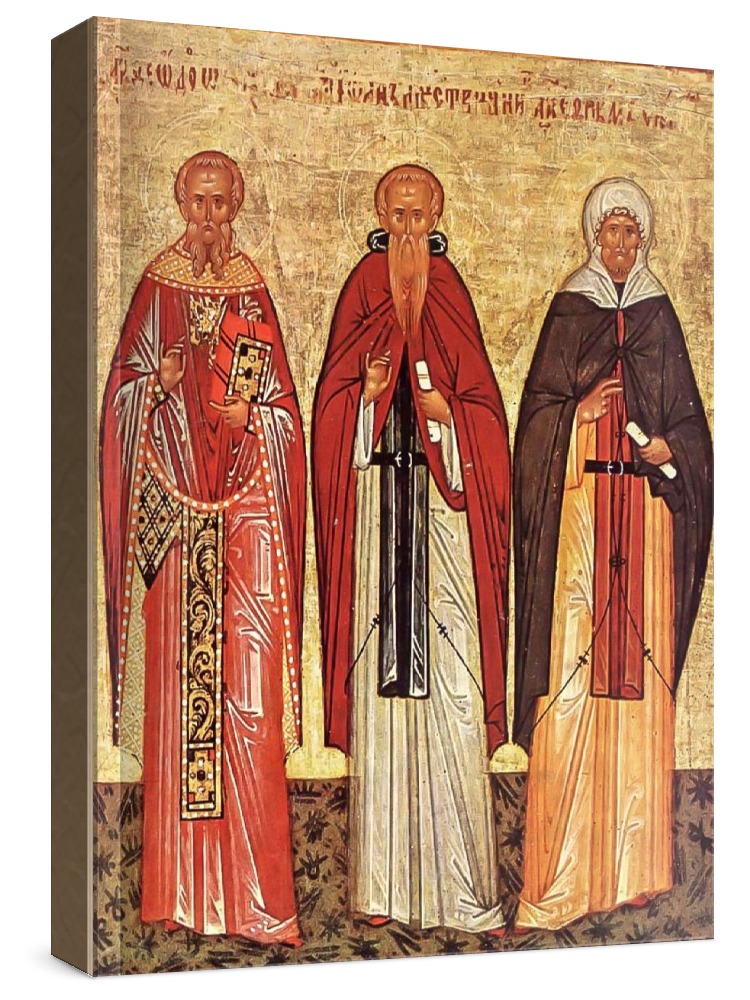 Икона феодор студит, феодосий великий, ефрем сирин (копия иконы 15 века). Икона на заказ. Срок изготовления - 5-14 дней. Изображение нанесено на основу из натурального хвойного дерева методом прямой печати (не полиграфия). При работе соблюдены размерные пропорции и цветовая гамма оригинальной старинной иконы. Деревянная основа иконы подвержена искусственному старению. Лик покрыт специальным лаком, что защищает икону от воздействий окружающей среды и обеспечивает хранение иконы в первозданном виде в течение нескольких десятилетий. Цена зависит от размера иконы (высота может незначительно отличаться от указанной величины в связи с точным соблюдением пропорций оригинала): 10x13 - 1500 руб. 30x40 - 5000 руб. 60x80 - 15000 руб. 15x18 - 2250 руб. 40x60 - 8000 руб. 80x120 - 20000 руб. 20x25 - 3000 руб.