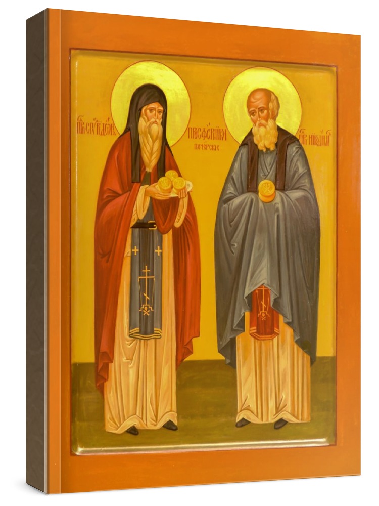 Спиридон и никодим печерские (икона на дереве). Икона на заказ. Срок изготовления - 5-14 дней. Изображение нанесено на основу из натурального хвойного дерева методом прямой печати (не полиграфия). Деревянная основа иконы подвержена искусственному старению. Лик покрыт специальным лаком, что защищает икону от воздействий окружающей среды и обеспечивает хранение иконы в первозданном виде в течение нескольких десятилетий. Цена зависит от размера иконы (высота может незначительно отличаться от указанной величины в связи с точным соблюдением пропорций образца-оригинала): 10x13 - 1500 руб. 30x40 - 5000 руб. 60x80 - 15000 руб. 15x18 - 2250 руб. 40x60 - 8000 руб. 80x120 - 20000 руб. 20x25 - 3000 руб.