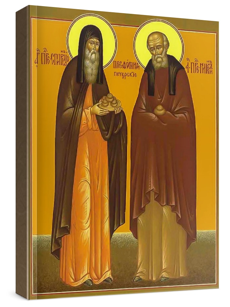 Спиридон и никодим печерские (икона на дереве). Икона на заказ. Срок изготовления - 5-14 дней. Изображение нанесено на основу из натурального хвойного дерева методом прямой печати (не полиграфия). Деревянная основа иконы подвержена искусственному старению. Лик покрыт специальным лаком, что защищает икону от воздействий окружающей среды и обеспечивает хранение иконы в первозданном виде в течение нескольких десятилетий. Цена зависит от размера иконы (высота может незначительно отличаться от указанной величины в связи с точным соблюдением пропорций образца-оригинала): 10x13 - 1500 руб. 30x40 - 5000 руб. 60x80 - 15000 руб. 15x18 - 2250 руб. 40x60 - 8000 руб. 80x120 - 20000 руб. 20x25 - 3000 руб.
