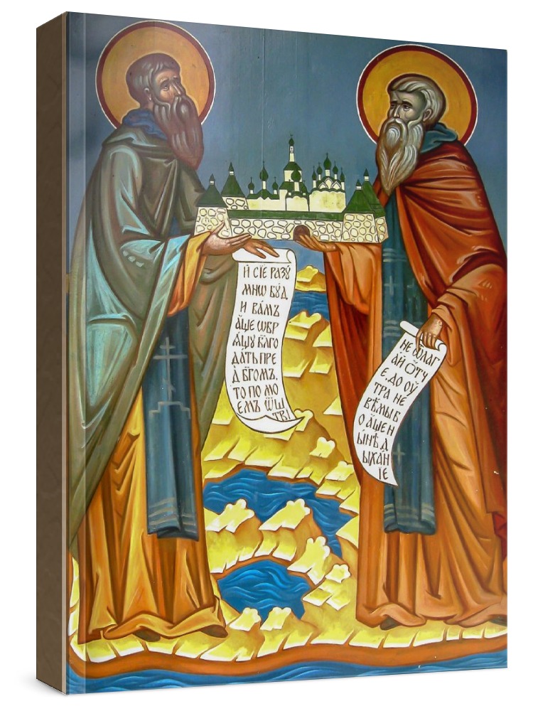 Зосима, савватий соловецкие (икона на дереве). Икона на заказ. Срок изготовления - 5-14 дней. Изображение нанесено на основу из натурального хвойного дерева методом прямой печати (не полиграфия). Деревянная основа иконы подвержена искусственному старению. Лик покрыт специальным лаком, что защищает икону от воздействий окружающей среды и обеспечивает хранение иконы в первозданном виде в течение нескольких десятилетий. Цена зависит от размера иконы (высота может незначительно отличаться от указанной величины в связи с точным соблюдением пропорций образца-оригинала): 10x13 - 1500 руб. 30x40 - 5000 руб. 60x80 - 15000 руб. 15x18 - 2250 руб. 40x60 - 8000 руб. 80x120 - 20000 руб. 20x25 - 3000 руб.