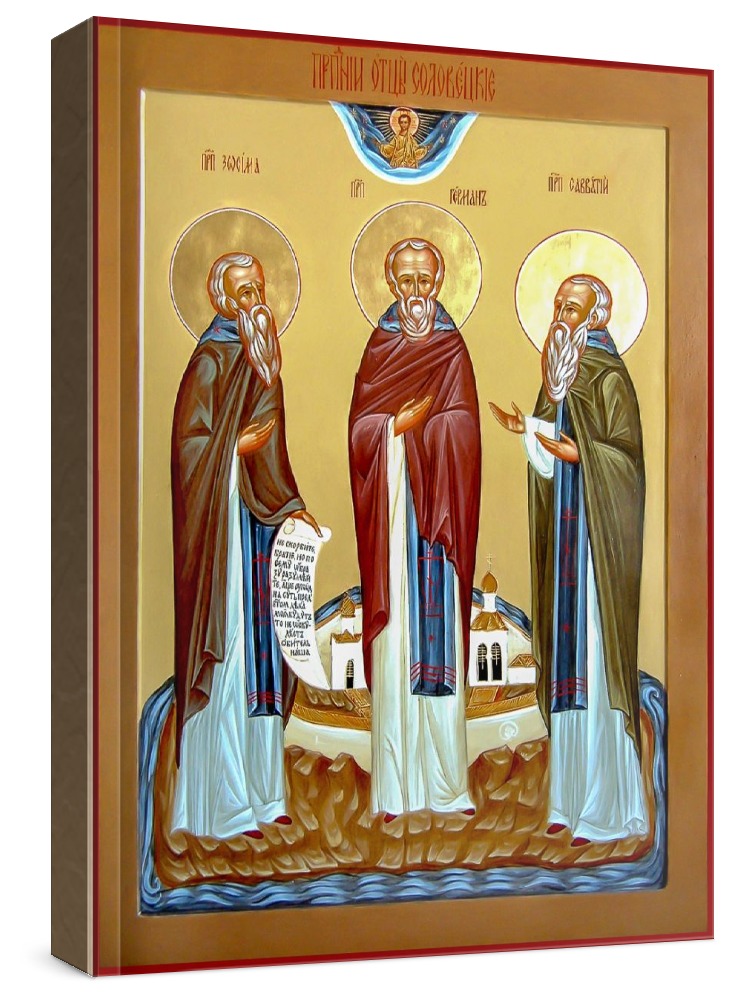 Зосима, герман и савватий соловецкие (икона на дереве). Икона на заказ. Срок изготовления - 5-14 дней. Изображение нанесено на основу из натурального хвойного дерева методом прямой печати (не полиграфия). Деревянная основа иконы подвержена искусственному старению. Лик покрыт специальным лаком, что защищает икону от воздействий окружающей среды и обеспечивает хранение иконы в первозданном виде в течение нескольких десятилетий. Цена зависит от размера иконы (высота может незначительно отличаться от указанной величины в связи с точным соблюдением пропорций образца-оригинала): 10x13 - 1500 руб. 30x40 - 5000 руб. 60x80 - 15000 руб. 15x18 - 2250 руб. 40x60 - 8000 руб. 80x120 - 20000 руб. 20x25 - 3000 руб.