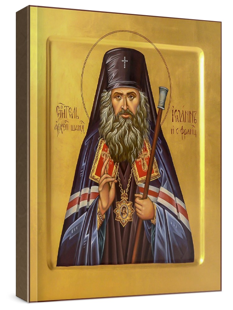 Иоанн шанхайский (икона на дереве). Икона на заказ. Срок изготовления - 5-14 дней. Изображение нанесено на основу из натурального хвойного дерева методом прямой печати (не полиграфия). Деревянная основа иконы подвержена искусственному старению. Лик покрыт специальным лаком, что защищает икону от воздействий окружающей среды и обеспечивает хранение иконы в первозданном виде в течение нескольких десятилетий. Цена зависит от размера иконы (высота может незначительно отличаться от указанной величины в связи с точным соблюдением пропорций образца-оригинала): 10x13 - 1500 руб. 30x40 - 5000 руб. 60x80 - 15000 руб. 15x18 - 2250 руб. 40x60 - 8000 руб. 80x120 - 20000 руб. 20x25 - 3000 руб.