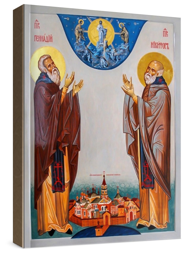 Никифор и геннадий важеозерские (икона на дереве). Икона на заказ. Срок изготовления - 5-14 дней. Изображение нанесено на основу из натурального хвойного дерева методом прямой печати (не полиграфия). Деревянная основа иконы подвержена искусственному старению. Лик покрыт специальным лаком, что защищает икону от воздействий окружающей среды и обеспечивает хранение иконы в первозданном виде в течение нескольких десятилетий. Цена зависит от размера иконы (высота может незначительно отличаться от указанной величины в связи с точным соблюдением пропорций образца-оригинала): 10x13 - 1500 руб. 30x40 - 5000 руб. 60x80 - 15000 руб. 15x18 - 2250 руб. 40x60 - 8000 руб. 80x120 - 20000 руб. 20x25 - 3000 руб.