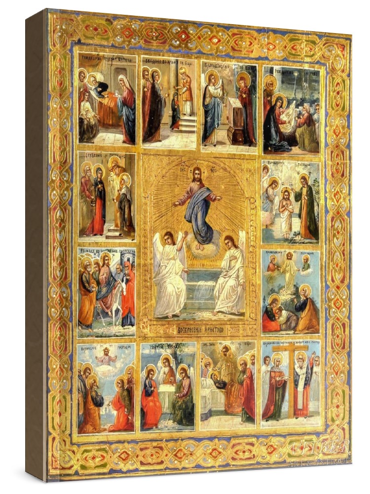 12 праздников (икона на дереве). Икона на заказ. Срок изготовления - 1-2 недели. Изображение нанесено на основу из натурального хвойного дерева методом прямой печати (не полиграфия). Деревянная основа иконы подвержена искусственному старению. Лик покрыт специальным лаком, что защищает икону от воздействий окружающей среды и обеспечивает хранение иконы в первозданном виде в течение нескольких десятилетий. Цена зависит от размера иконы (высота может незначительно отличаться от указанной величины в связи с точным соблюдением пропорций оригинала): 10x13*- 1500 руб. 30x40 - 5000 руб. 60x80 - 15000 руб. 15x18 - 2250 руб. 40x60 - 8000 руб. 80x120 - 20000 руб. 20x25 - 3000 руб. * - изготовление иконы 10х13 см возможно только при заказе от 3 шт.