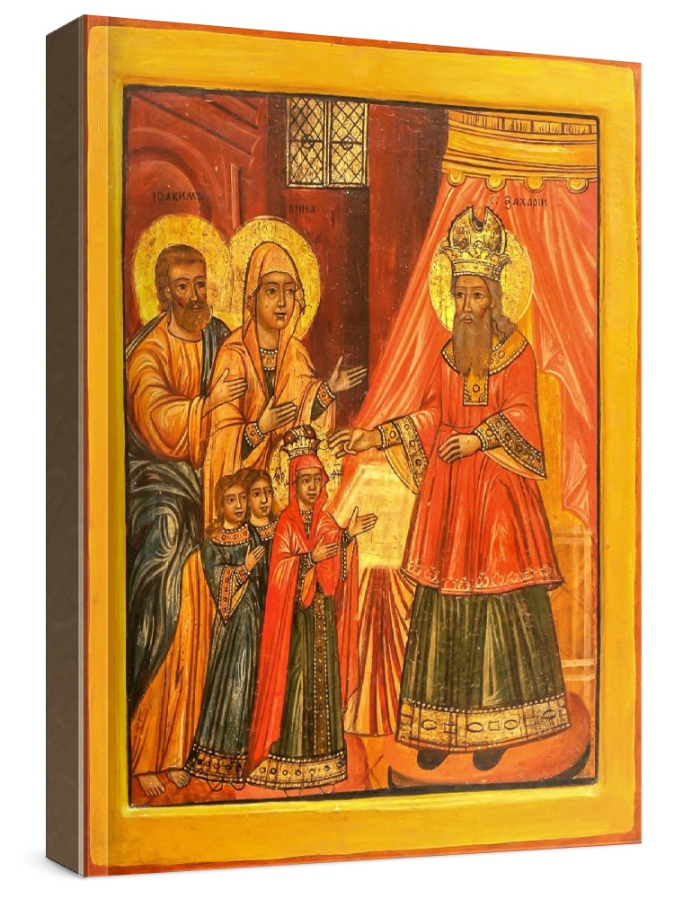 Икона введение во храм пресвятой богородицы (копия старинной иконы). Икона на заказ. Срок изготовления - 5-14 дней. Изображение нанесено на основу из натурального хвойного дерева методом прямой печати (не полиграфия). При работе соблюдены размерные пропорции и цветовая гамма оригинальной старинной иконы. Деревянная основа иконы подвержена искусственному старению. Лик покрыт специальным лаком, что защищает икону от воздействий окружающей среды и обеспечивает хранение иконы в первозданном виде в течение нескольких десятилетий. Цена зависит от размера иконы (высота может незначительно отличаться от указанной величины в связи с точным соблюдением пропорций оригинала): 10x13 - 1500 руб. 30x40 - 5000 руб. 60x80 - 15000 руб. 15x18 - 2250 руб. 40x60 - 8000 руб. 80x120 - 20000 руб. 20x25 - 3000 руб.