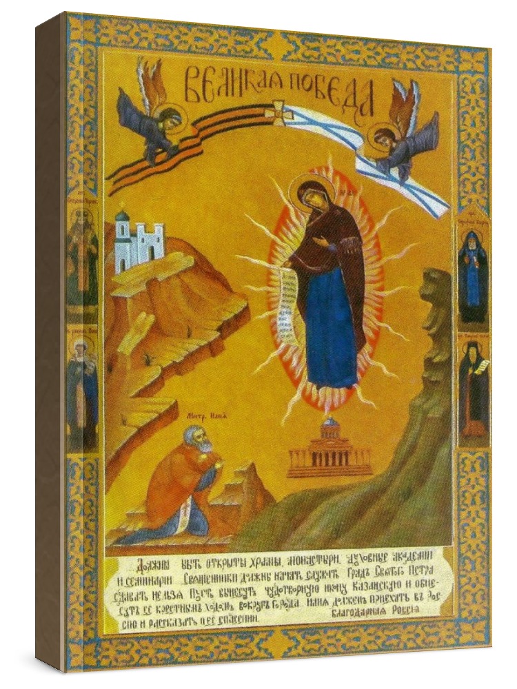 Великая победа (икона на дереве). Икона на заказ. Срок изготовления - 5-14 дней. Изображение нанесено на основу из натурального хвойного дерева методом прямой печати (не полиграфия). Деревянная основа иконы подвержена искусственному старению. Лик покрыт специальным лаком, что защищает икону от воздействий окружающей среды и обеспечивает хранение иконы в первозданном виде в течение нескольких десятилетий. Цена зависит от размера иконы (высота может незначительно отличаться от указанной величины в связи с точным соблюдением пропорций образца-оригинала): 10x13 - 1500 руб. 30x40 - 5000 руб. 60x80 - 15000 руб. 15x18 - 2250 руб. 40x60 - 8000 руб. 80x120 - 20000 руб. 20x25 - 3000 руб.