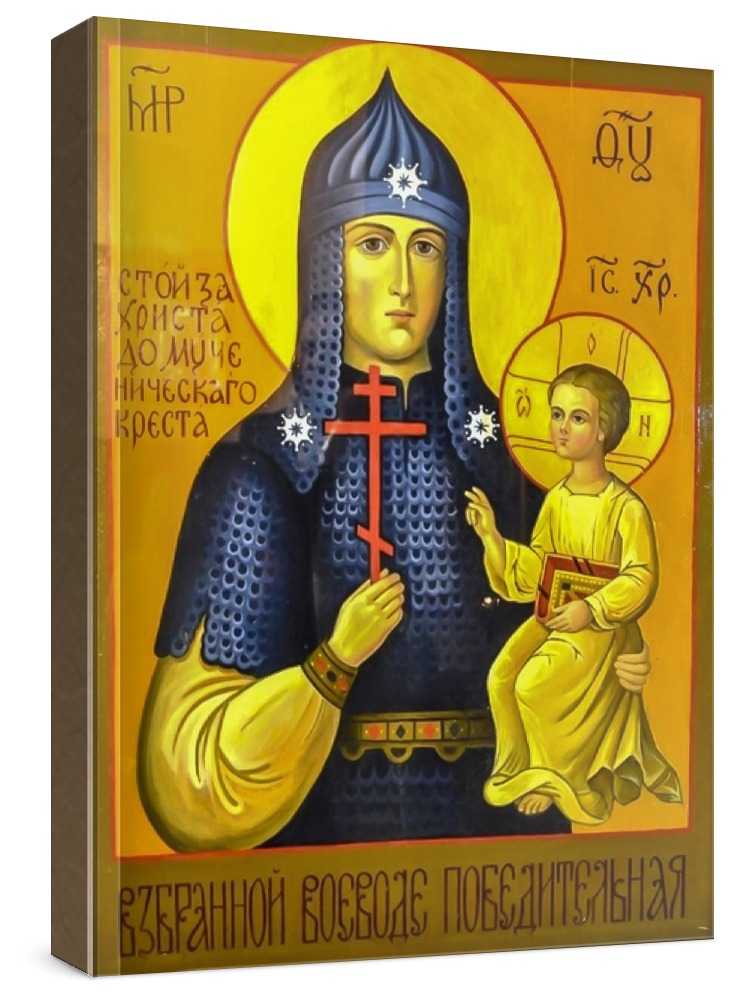 Взбранной воеводе победительная (икона на дереве). Икона на заказ. Срок изготовления - 5-14 дней. Изображение нанесено на основу из натурального хвойного дерева методом прямой печати (не полиграфия). Деревянная основа иконы подвержена искусственному старению. Лик покрыт специальным лаком, что защищает икону от воздействий окружающей среды и обеспечивает хранение иконы в первозданном виде в течение нескольких десятилетий. Цена зависит от размера иконы (высота может незначительно отличаться от указанной величины в связи с точным соблюдением пропорций образца-оригинала): 10x13 - 1500 руб. 30x40 - 5000 руб. 60x80 - 15000 руб. 15x18 - 2250 руб. 40x60 - 8000 руб. 80x120 - 20000 руб. 20x25 - 3000 руб.