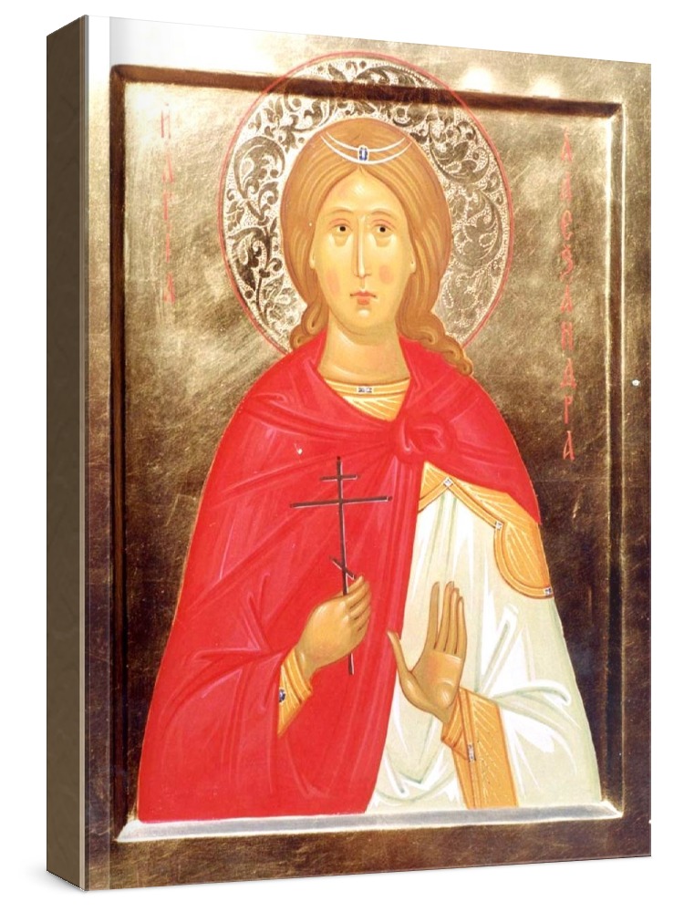 Александра анкирская (коринфская) (икона на дереве). Икона на заказ. Срок изготовления - 5-14 дней. Изображение нанесено на основу из натурального хвойного дерева методом прямой печати (не полиграфия). Деревянная основа иконы подвержена искусственному старению. Лик покрыт специальным лаком, что защищает икону от воздействий окружающей среды и обеспечивает хранение иконы в первозданном виде в течение нескольких десятилетий. Цена зависит от размера иконы (высота может незначительно отличаться от указанной величины в связи с точным соблюдением пропорций образца-оригинала): 10x13 - 1500 руб. 30x40 - 5000 руб. 60x80 - 15000 руб. 15x18 - 2250 руб. 40x60 - 8000 руб. 80x120 - 20000 руб. 20x25 - 3000 руб.