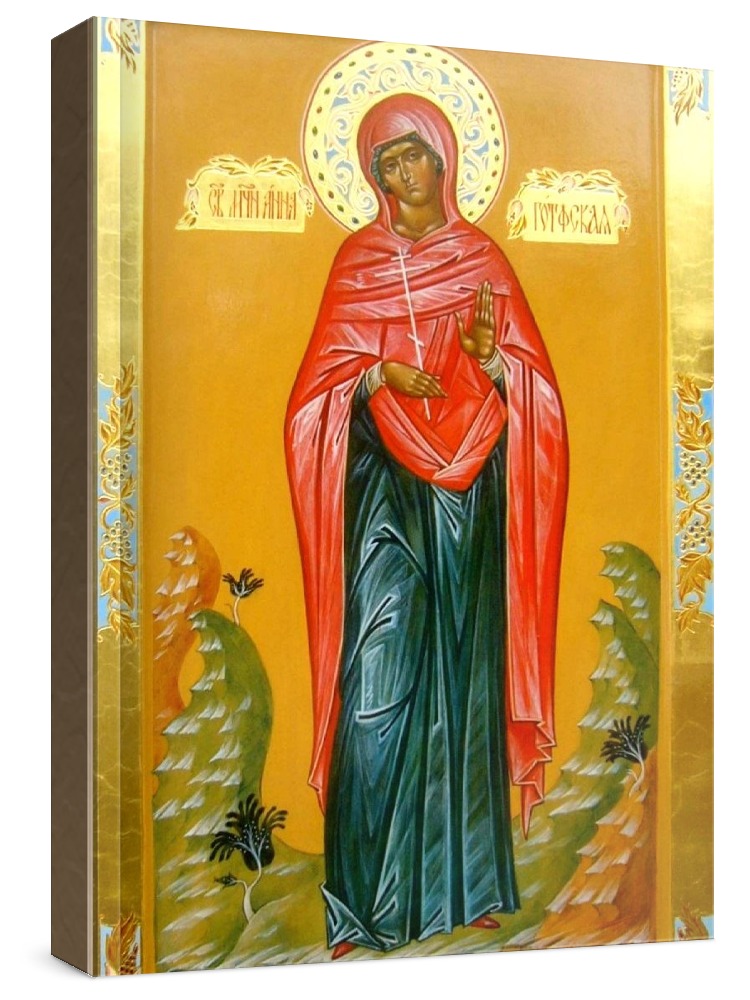 Анна готфская (икона на дереве). Икона на заказ. Срок изготовления - 5-14 дней. Изображение нанесено на основу из натурального хвойного дерева методом прямой печати (не полиграфия). Деревянная основа иконы подвержена искусственному старению. Лик покрыт специальным лаком, что защищает икону от воздействий окружающей среды и обеспечивает хранение иконы в первозданном виде в течение нескольких десятилетий. Цена зависит от размера иконы (высота может незначительно отличаться от указанной величины в связи с точным соблюдением пропорций образца-оригинала): 10x13 - 1500 руб. 30x40 - 5000 руб. 60x80 - 15000 руб. 15x18 - 2250 руб. 40x60 - 8000 руб. 80x120 - 20000 руб. 20x25 - 3000 руб.