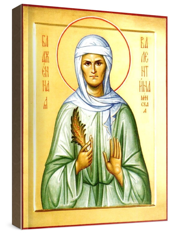 Валентина минская (икона на дереве). Икона на заказ. Срок изготовления - 5-14 дней. Изображение нанесено на основу из натурального хвойного дерева методом прямой печати (не полиграфия). Деревянная основа иконы подвержена искусственному старению. Лик покрыт специальным лаком, что защищает икону от воздействий окружающей среды и обеспечивает хранение иконы в первозданном виде в течение нескольких десятилетий. Цена зависит от размера иконы (высота может незначительно отличаться от указанной величины в связи с точным соблюдением пропорций образца-оригинала): 10x13 - 1500 руб. 30x40 - 5000 руб. 60x80 - 15000 руб. 15x18 - 2250 руб. 40x60 - 8000 руб. 80x120 - 20000 руб. 20x25 - 3000 руб.