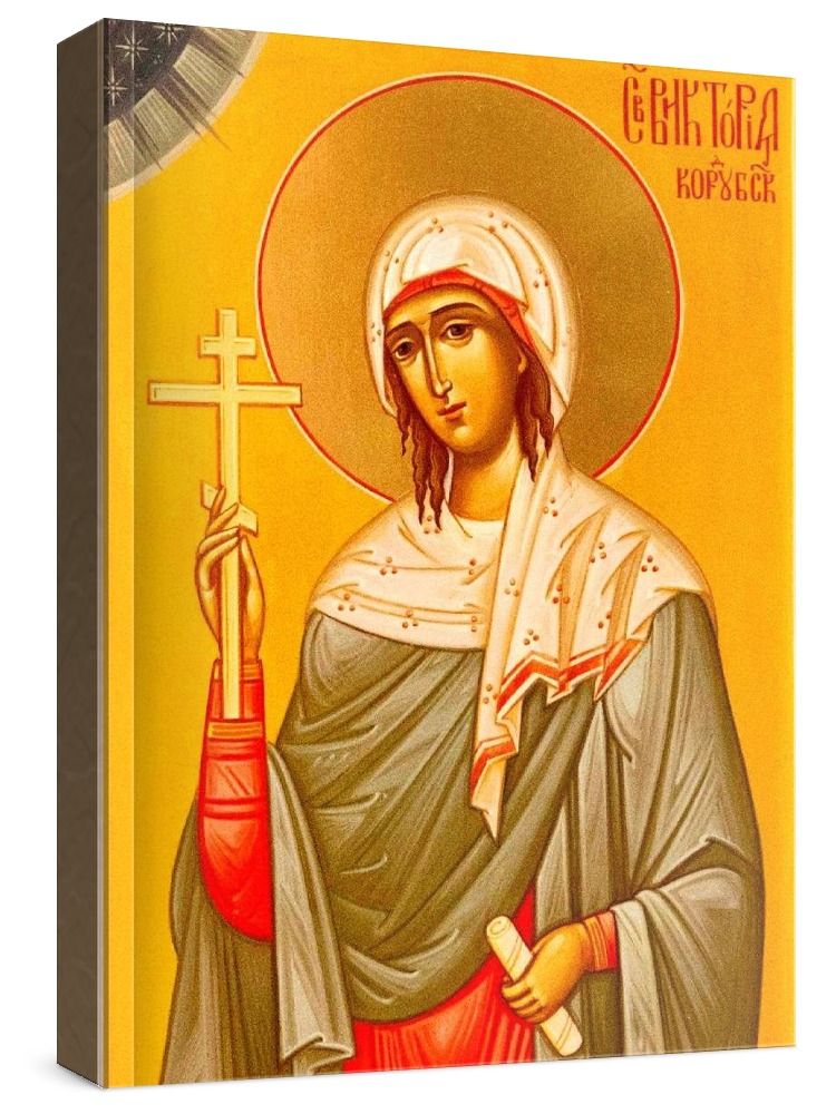 Виктория кордувийская (икона на дереве). Икона на заказ. Срок изготовления - 5-14 дней. Изображение нанесено на основу из натурального хвойного дерева методом прямой печати (не полиграфия). Деревянная основа иконы подвержена искусственному старению. Лик покрыт специальным лаком, что защищает икону от воздействий окружающей среды и обеспечивает хранение иконы в первозданном виде в течение нескольких десятилетий. Цена зависит от размера иконы (высота может незначительно отличаться от указанной величины в связи с точным соблюдением пропорций образца-оригинала): 10x13 - 1500 руб. 30x40 - 5000 руб. 60x80 - 15000 руб. 15x18 - 2250 руб. 40x60 - 8000 руб. 80x120 - 20000 руб. 20x25 - 3000 руб.