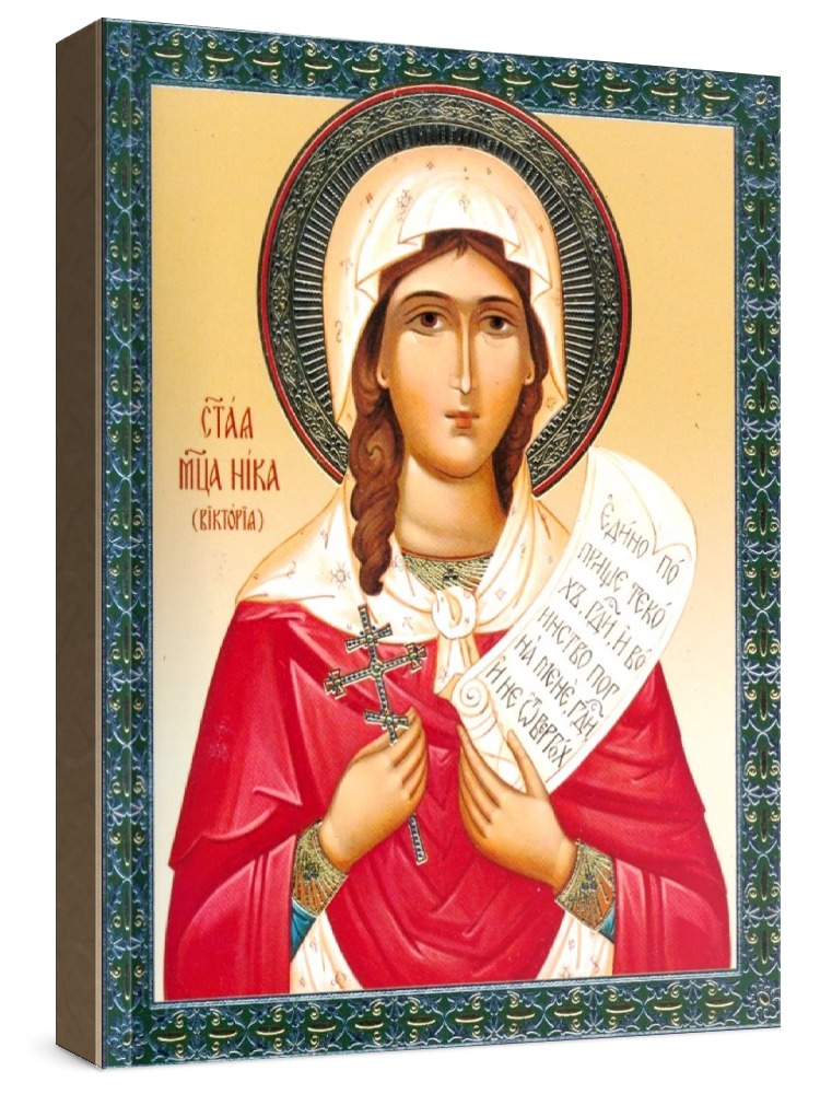 Виктория эфесская (икона на дереве). Икона на заказ. Срок изготовления - 5-14 дней. Изображение нанесено на основу из натурального хвойного дерева методом прямой печати (не полиграфия). Деревянная основа иконы подвержена искусственному старению. Лик покрыт специальным лаком, что защищает икону от воздействий окружающей среды и обеспечивает хранение иконы в первозданном виде в течение нескольких десятилетий. Цена зависит от размера иконы (высота может незначительно отличаться от указанной величины в связи с точным соблюдением пропорций образца-оригинала): 10x13 - 1500 руб. 30x40 - 5000 руб. 60x80 - 15000 руб. 15x18 - 2250 руб. 40x60 - 8000 руб. 80x120 - 20000 руб. 20x25 - 3000 руб.